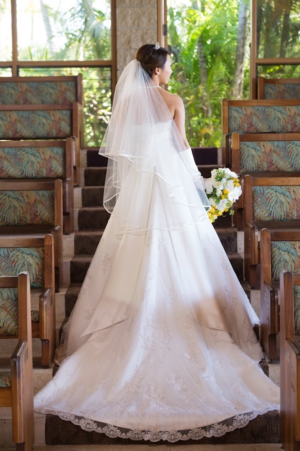日差しの強いハワイでの挙式、そして背中をざっくり見せるAラインのドレスのため